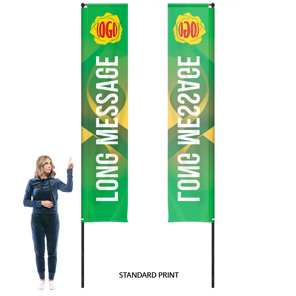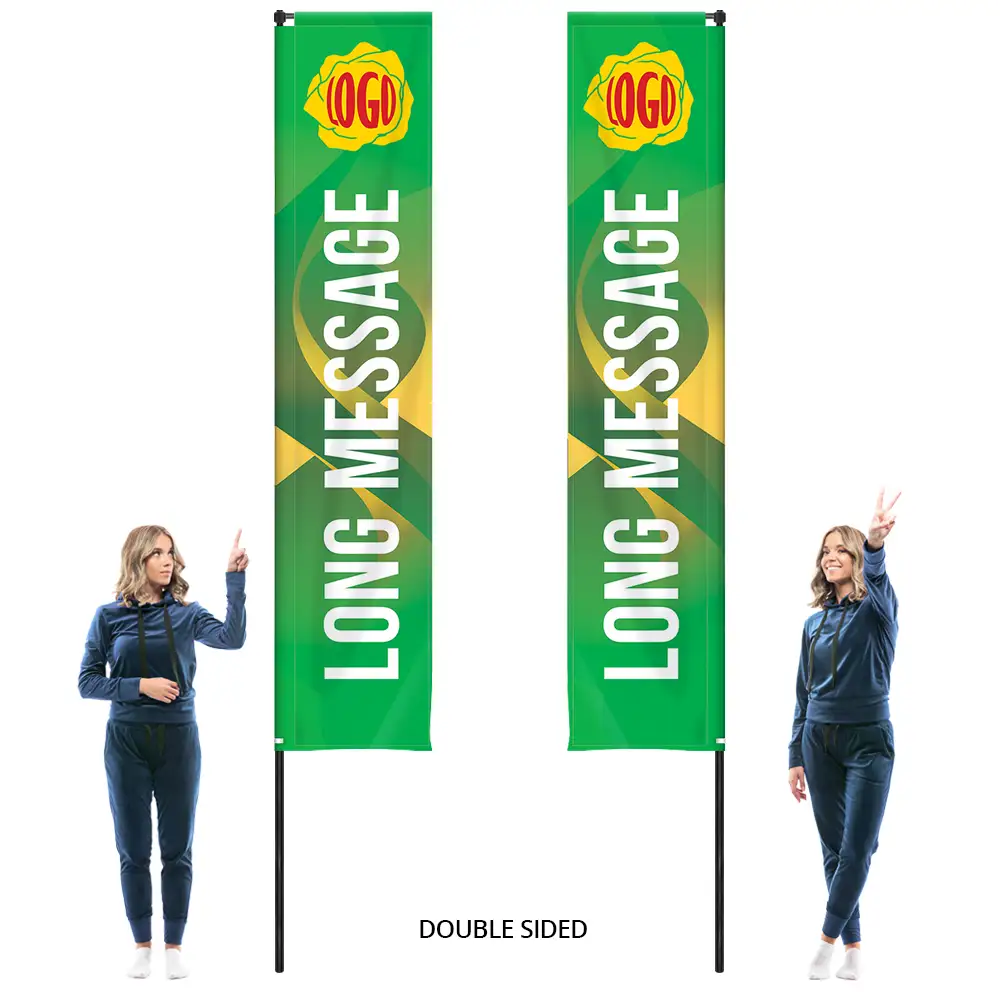 The banner-shaped design ensures your message is displayed prominently and remains taut in windy conditions. Its sleek, vertical shape creates a modern and professional look, making it a popular choice for businesses that want to showcase their brand in a clear and attractive way.
