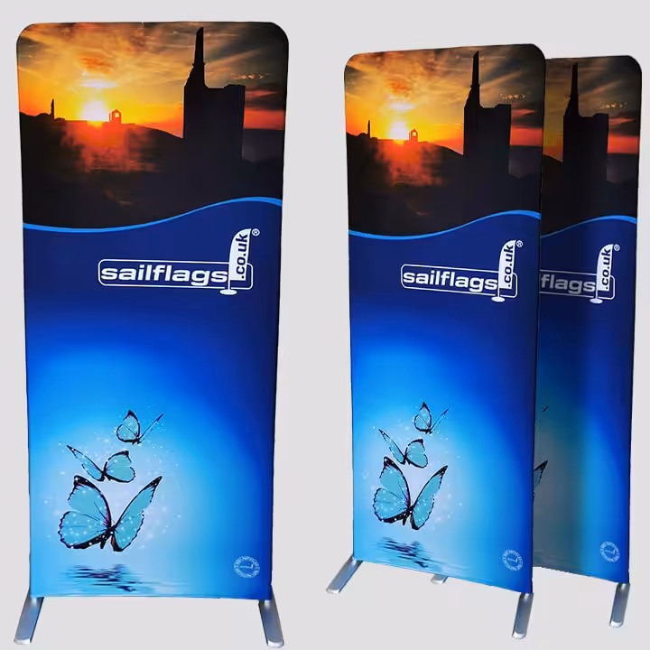 The Sailflags Fabric Banner Stand is a premium, lightweight display solution ideal for exhibitions, retail spaces, and indoor promotions. Featuring a custom-printed 260gsm stretch fabric cover over a durable aluminium frame, it offers easy setup and portability. Available in a range of widths from 850mm to 2500mm, the banner stand is washable and features replaceable fabric for long-lasting use. Perfect for creating impactful, adaptable indoor advertising that grabs attention and enhances your display. Custom Printed With Your Design!