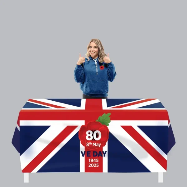 Crafted with premium quality HD cloth, this tablecloth is designed to elevate your VE Day celebrations. Measuring 1.8m wide with a 74cm top and 74cm drop, it provides excellent coverage for a polished, professional look. Featuring the commemorative VE Day 80th Anniversary logo, it’s the perfect centrepiece for honouring this historic occasion. The fabric is washable at low temperatures and can be ironed at low heat, making it a durable and reusable option for multiple events. Proudly made from eco-friendly materials, this tablecloth combines sustainability with practicality, making it ideal for formal gatherings, street parties, or commemorative events.
