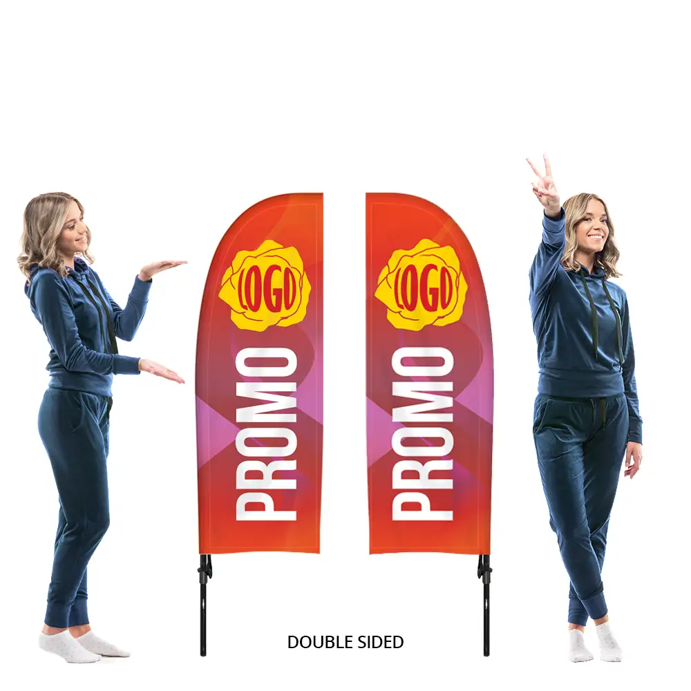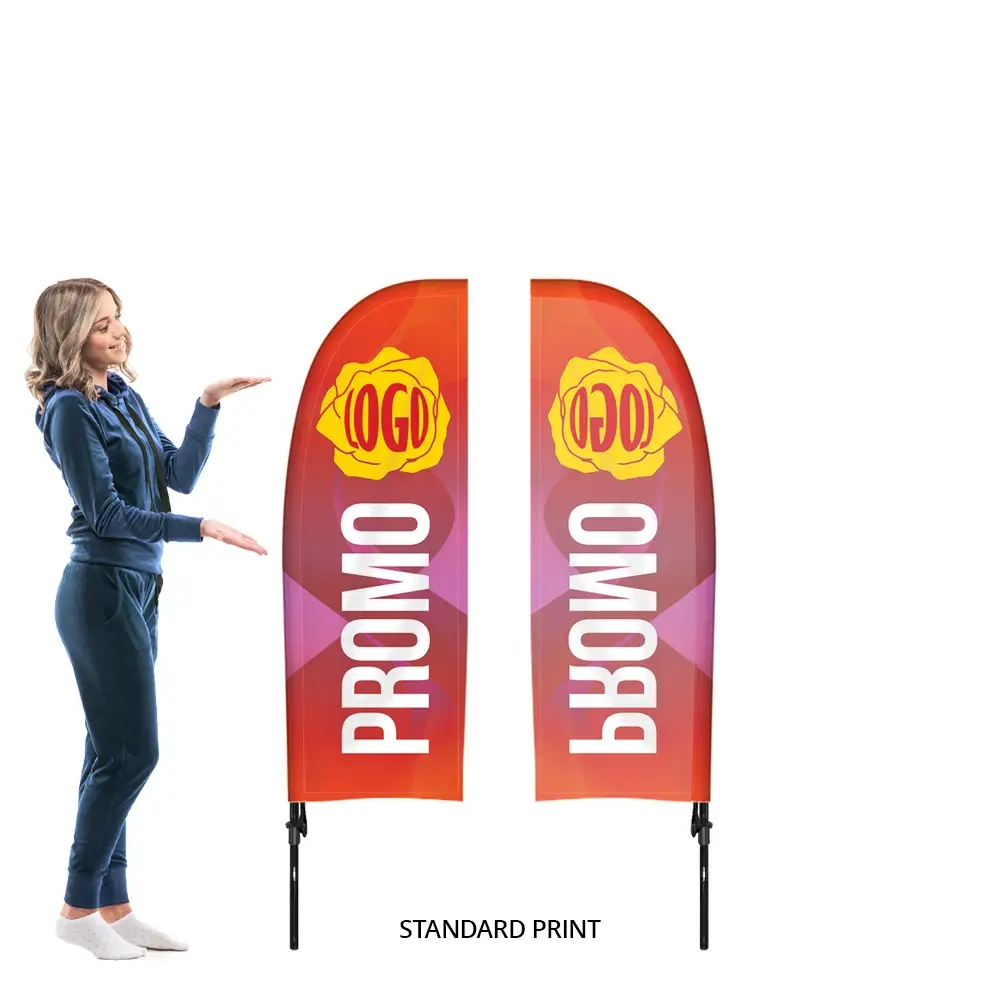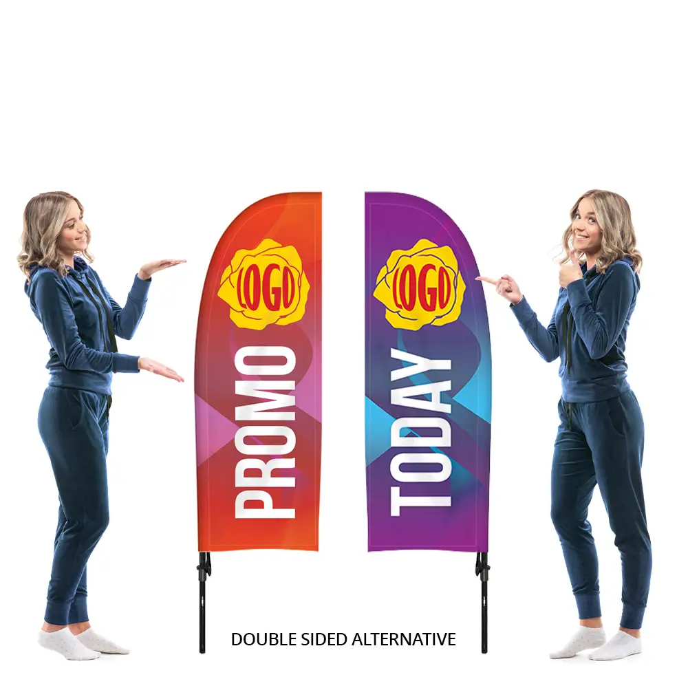 The feather-shaped design is sleek and modern, making the flag stand out in any environment. Its vertical shape ensures that your branding or promotional message is displayed clearly and remains taut in windy conditions, ensuring a professional and attractive look at all times.