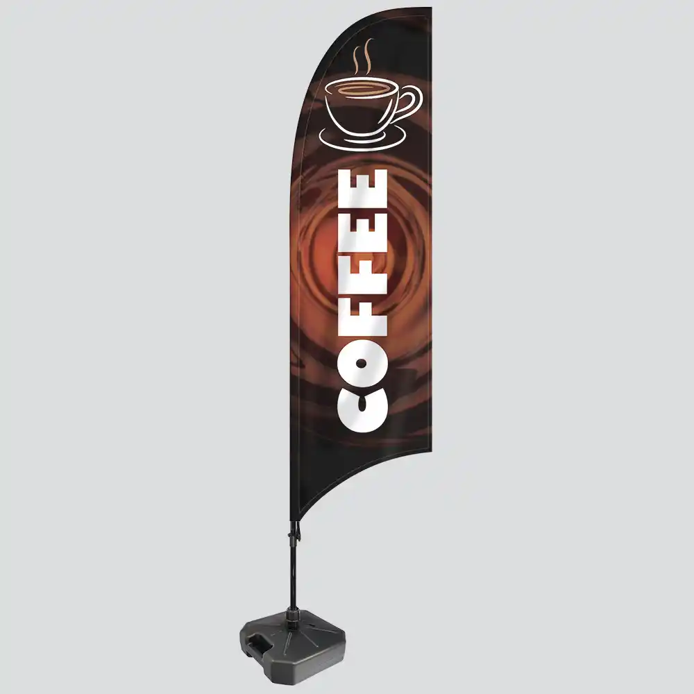 Sustainability matters, and that’s why our Coffee Feather Flags are made using 100% recycled polyester. This eco-conscious choice allows you to promote your business while being kind to the planet. It’s a small but impactful way to align your advertising with environmentally friendly practices.
