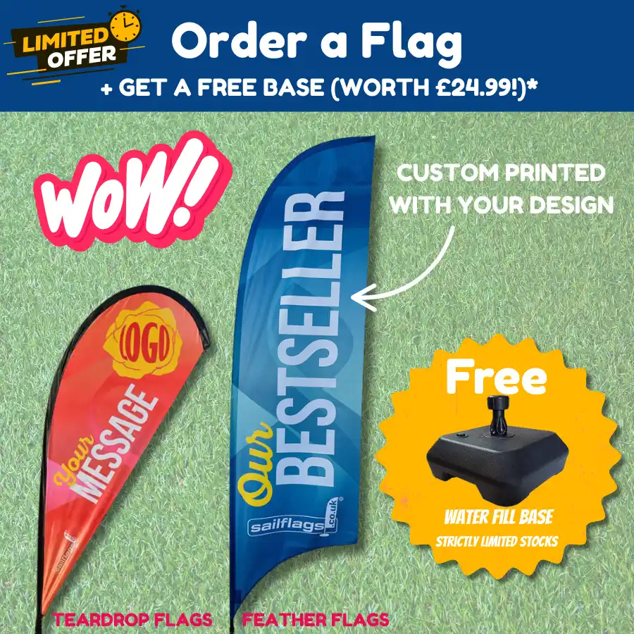 ⏰ Free Water Base With Eligible Flags – While Stocks Last! Order a 1.7m, 2.4m or 3.2m Feather Flag or a 1.7m or 2.7m Teardrop Flag and get a free water fill base – plus free design support with every order.