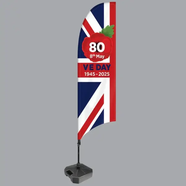 Celebrate VE Day's 80th Anniversary with this 3.2m Feather Flag featuring a striking Union Jack design, vibrant poppy emblem, and commemorative dates (1945–2025). Includes a carbon fibre flagpole and a choice of bases, including weighted bases, ground spikes, or wall-mounted brackets. Available in single-sided or double-sided print, this durable, weather-resistant flag is perfect for events, street parties, or patriotic displays.