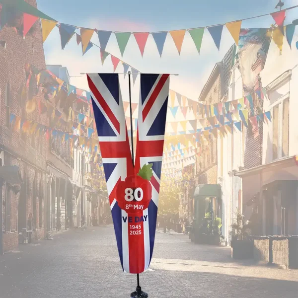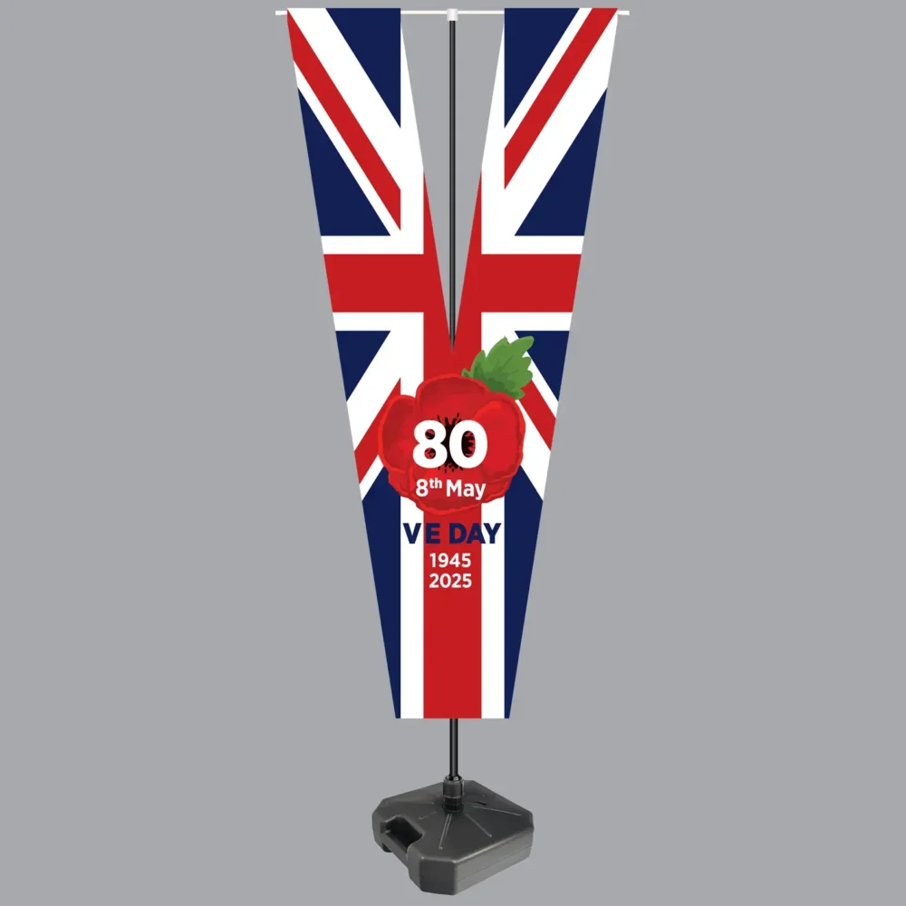Mark the 80th Anniversary of VE Day with this Limited Edition V-Shaped commemorative flag. Featuring a striking Union Jack design, remembrance poppy, and bold anniversary branding, this adjustable-height flag (up to 3m) is perfect for councils, events, and remembrance services. Limited stock available – order now!