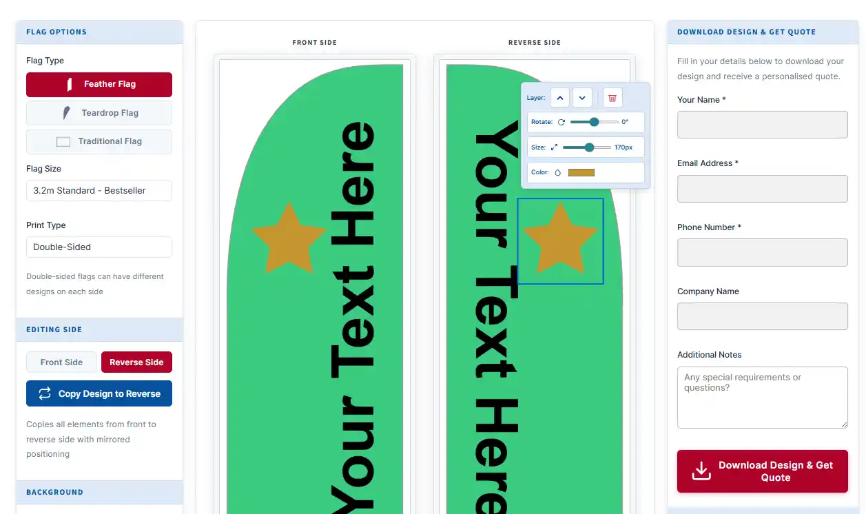Each template reflects the real proportions of the chosen flag style, helping you visualise your layout accurately from the start.