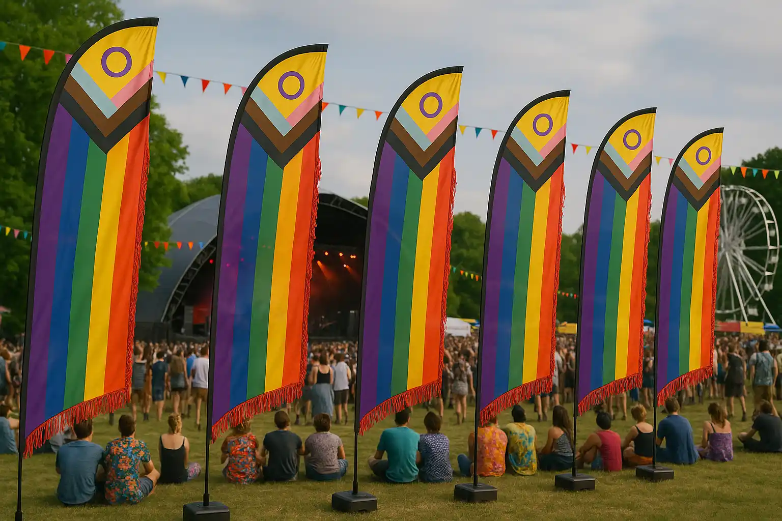 Celebrate inclusivity with one of the most vibrant and eye-catching Pride Flags available. Our 3.2m Progress Pride Feather Flag features the full Progress design, complete with vivid rainbow colours, trans stripes, black and brown chevrons, and the intersex circle — all brought to life through high-quality dye-sublimation printing.