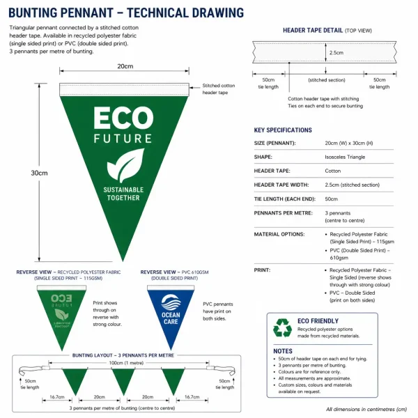 At Sailflags, our bunting is manufactured in-house using premium materials, with options in eco-friendly recycled polyester or heavy-duty PVC. Whether you’re promoting a brand, decorating an event, or creating a festive atmosphere, our bunting delivers high-impact visual appeal with long-lasting durability.
