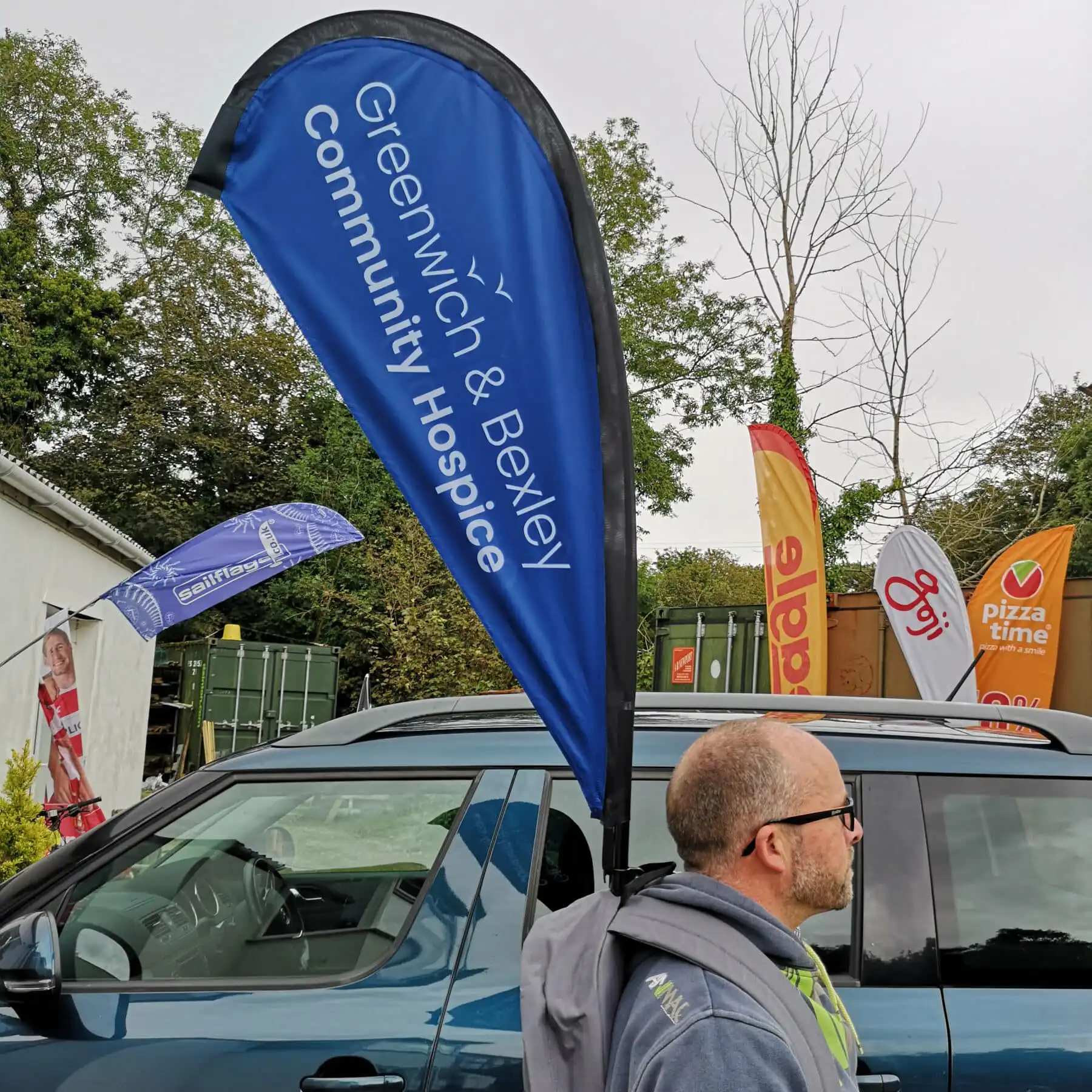 Ideal for both indoor and outdoor use, teardrop flags are widely used for shopfronts, exhibitions, events, and forecourts, where reliable visibility and strong branding are essential. Each flag is custom printed in full colour using dye-sublimation printing for vibrant, long-lasting results, and produced using durable recycled fabric.
