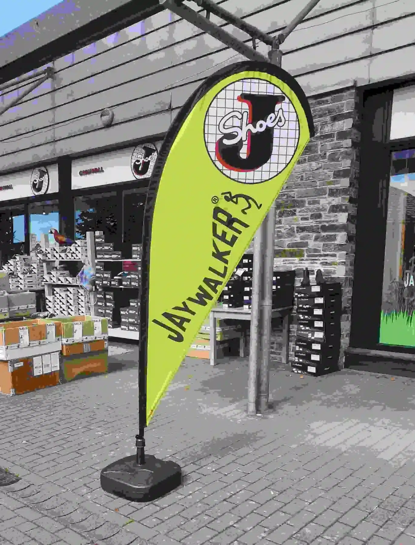 Teardrop flags are a professional and eye-catching way to promote your business both indoors and outdoors. Each flag is custom-printed with your logo, message, or design, creating a distinctive curved display that keeps your artwork clear, tensioned, and visible at all times. Their unique shape makes them particularly effective where consistent branding and readability are important, such as shopfronts, exhibitions, events, and forecourts