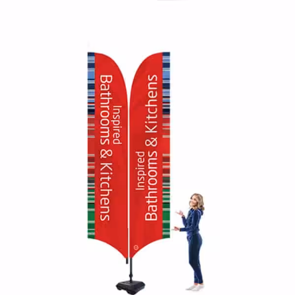 The long Sailflag is designed for display at outdoor events or inside large exhibition halls. Can also be used where space allows outside premises set back from the road or pavement.